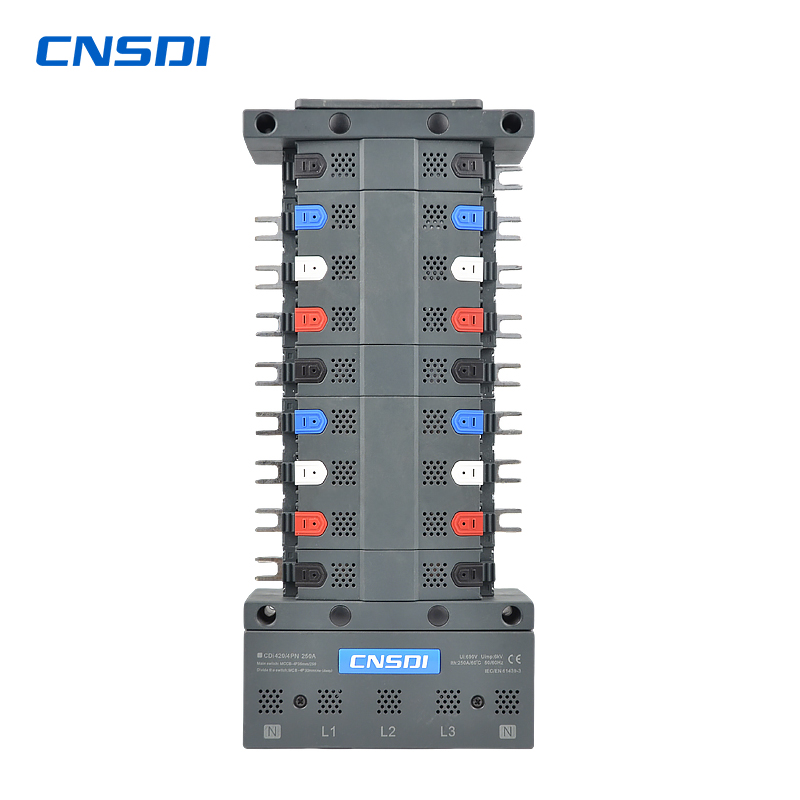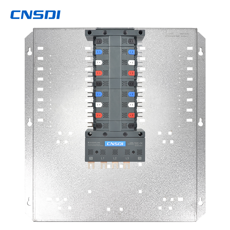CNSDI's CDi420-4PN Busbar Pan Assembly is a high-performance electrical distribution solution. This isolation Busbar Pan Assembly provides a quick and easy method to connect MCCBs.The Ie rated operational current 250A and Ue rated operational voltage of 415V at 50 Hz This Pan Assembly can have both top or bottom feeding This Pan Assembly is compatibility with incomer 4PN and ootgoer 4P devices The number of outgoing ways in Busbar Pan Assembly is 16 with pitch of 30mm. It is suitable for standard, commercial and industrial applications. The Ui rated insulation voltage is 500VAC with Uimp rated impulse voltage of 6kV.This product complies with IEC/EN 61439-3 standard.